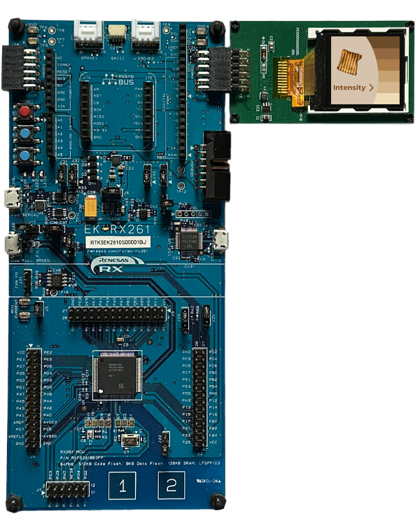 The RX261 Evaluation Kit (EK-RX261) can be combined with an external display controller via SPI/DMA interface, which contains its own display memory. As a result, the entire framebuffer can be located inside the display controller and only a small scratch-pad buffer is needed inside the micro-controller (MCU). For this purpose, Embedded Wizard supports a partial display update, that makes it possible to update the display in sequential small areas. This makes it possible to operate with a scratch-pad buffer of a few kilobytes instead of a full-screen framebuffer within the memory space of the MCU.