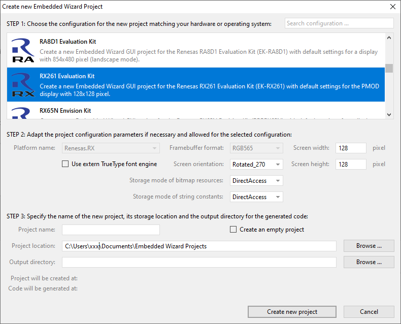 In order to create your own UI project suitable for the Renesas RX261 target, you can create a new project and select the RX261 Evaluation Kit project template: