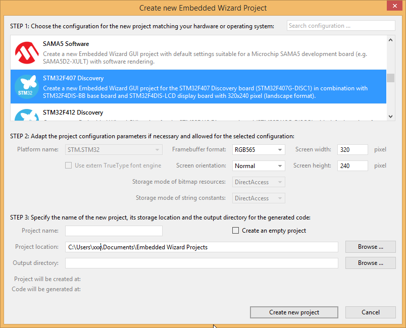 As a result you get a new Embedded Wizard project, that contains the necessary Profile attributes suitable for the STM32F407 Discovery board:
