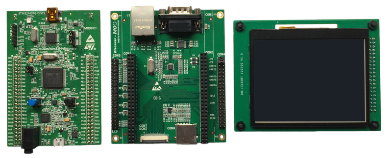 STM32F407 Discovery board, STM32F4DIS-BB base board and STMF4DIS-LCD display module.