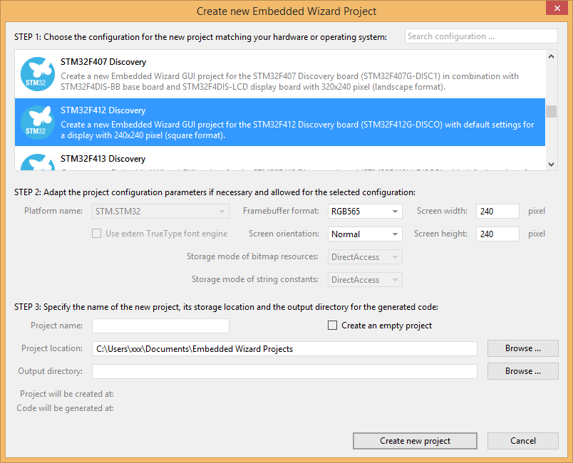 As a result you get a new Embedded Wizard project, that contains the necessary Profile attributes suitable for the STM32F412 Discovery board: