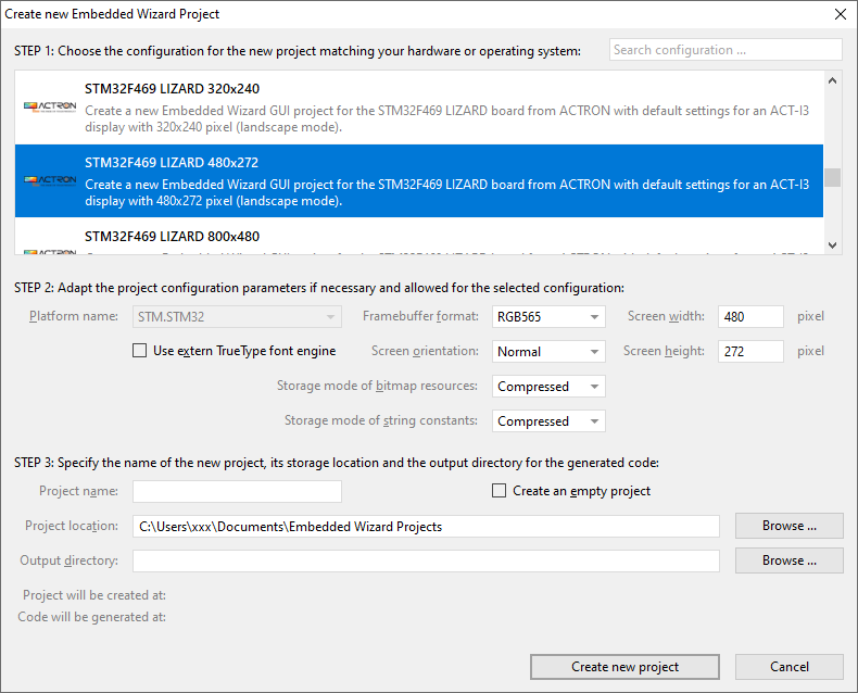 In order to create your own UI project suitable for the STM32F469 LIZARD board, you can create a new project and select one of the STM32F469 LIZARD project templates:
