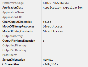 ★The attributes ModeOfBitmapResources and ModeOfStringConstants should be set to DirectAccess. This ensures that the resources are taken directly from flash memory.