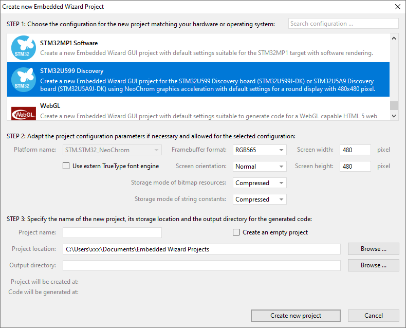 ★Screen size - If the size of your display is different compared to the display of the STM32U599 Discovery board (480x480 pixel), please adapt the attribute ScreenSize of the UI project and the size of the framebuffer within the file ewconfig.h accordingly.