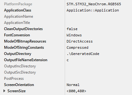 ★The attribute PlatformPackage should refer to the STM32 NeoChrom Platform Package. Please note, that for STM32U5G9 only the color formats RGB565, RGB888 or RGBA8888 can be used. Due to the limited SRAM, we recommend to use RGB565.