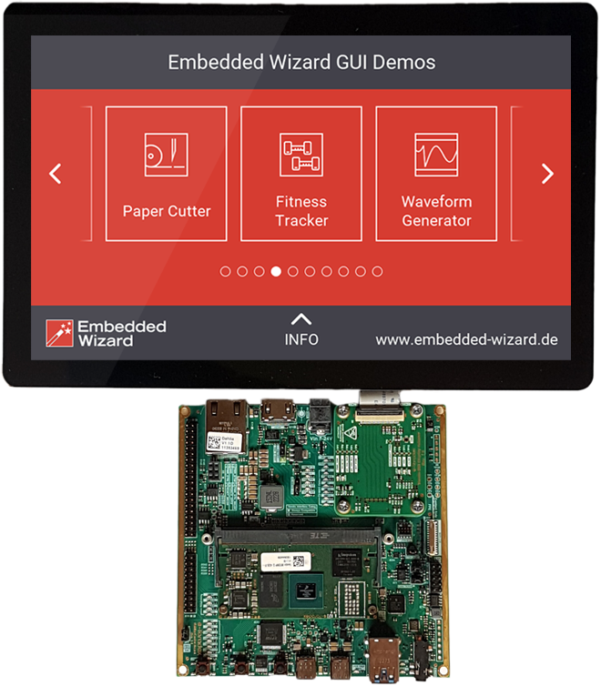 After a few seconds the Embedded Wizard MasterDemo should be installed and started on your target. This is the resulting application on a Toradex i.MX8 Development Kit: