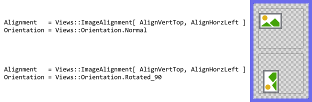 Modifying the Orientation property has also an effect on how the image is aligned within the view's area. For example, if you have configured the Group view to align the displayed image at its top-left corner and then you rotate the image 90 degrees counterclockwise, the image will in fact appear aligned to the bottom-left corner of the view. The following figure demonstrates it (the gray borders indicate the view areas):