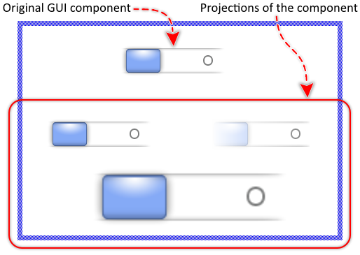 The Mosaic class Views::Group implements a graphical object specialized to show the projection of an existing GUI component. In this manner multiple images of the original component can appear simultaneously at various screen locations, every time with different settings like opacity, scaling, etc. This so-called Group view can be used to compose the appearance of a GUI component, e.g. to add simple visual mirroring effects or while performing fancy fading animations. The following screenshot demonstrates few examples of how Group views appear in the canvas area of Composer (and accordingly on the screen in your target device):