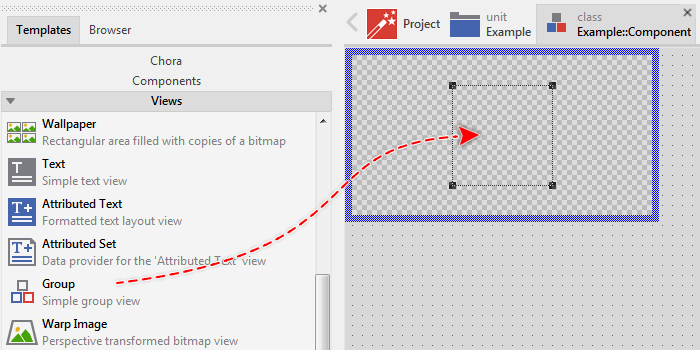 The Group view is ideal to perform fancy animations and transitions with the image of the original component. For example, you can implement an application which fades-in the image of an embedded component by scaling it dynamically from the center of the screen. Once the image has reached the size of the original component, the Group view disappears and the original component becomes visible. From the users perspective, the component was visible all the time. The following steps describe how such application case can be done: