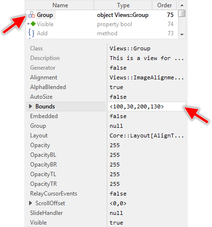 As long as the Group view is selected you can inspect and modify its properties conveniently in the Inspector window as demonstrated with the property Bounds in the screenshot below: