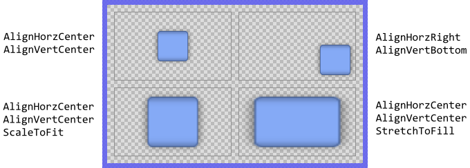 If desired, with the property Alignment you can determine other behavior how the Group view should react when its size and the size of the associated component are different. In particular, you can align the displayed component image at the edges of the Group view or you can instruct the view to proportionally scale or even stretch the image so it fits within the available area. The following figure demonstrates few examples of how the initialization of the property Alignment affects the image layout (the gray borders indicate the view areas):
