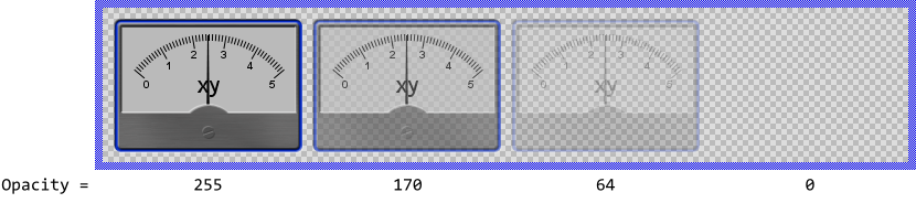 Using the property Opacity you can modulate the original opacity of the displayed component image, so that it appears semi-transparent even if the original content was opaque. The valid values for the property Opacity are 0 .. 255, whereby the smaller the value the more transparent the resulting image. For example: