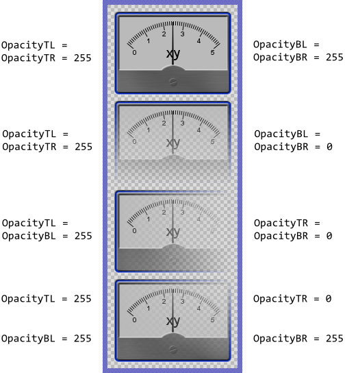 Alternatively you can specify for every corner (top-left, top-right, bottom-right and bottom-left) an individual opacity value resulting in the component image being modulated by an opacity gradient. For this purpose modify the corresponding properties OpacityTL, OpacityTR, OpacityBR and OpacityBL. For example: