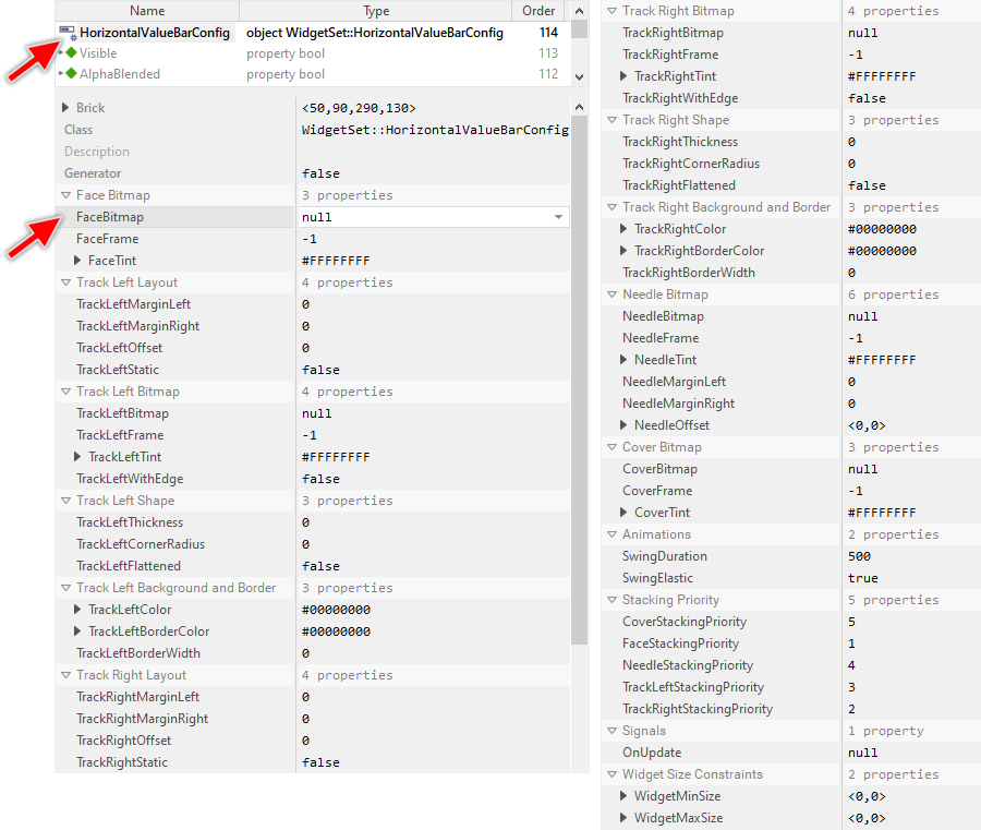 As long as the Horizontal Value Bar Config object is selected you can inspect and modify its properties conveniently in the Inspector window as demonstrated with the property FaceBitmap in the screenshot below. Please note, for better overview the below screenshot has been made with Inspector window being configured to sort the properties by categories: