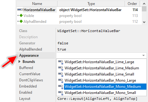 To use the desired appearance configuration you have to select it in the property Appearance of the affected Horizontal Value Bar widget as demonstrated in the screenshot below. You can use the integrated Inspector Assistant window to conveniently select the right configuration. If you like the provided default configurations then you can use them as they are: