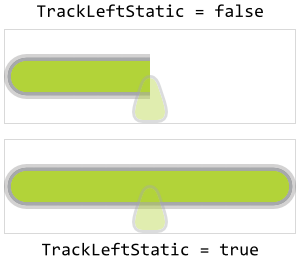 This property controls the appearance of the left track at its edge corresponding to the actual needle position. Per default the corners at the edge are rounded according to the value specified in the above mentioned TrackLeftCornerRadius property. By configuring the property TrackLeftFlattened with the value true, the corner rounding occurs only when the track has assumed its rightmost position. As long as the track is smaller, the edge at the actual needle position is clipped (it appears flattened). The rightmost position for the track is configured by the property TrackLeftMarginRight. |