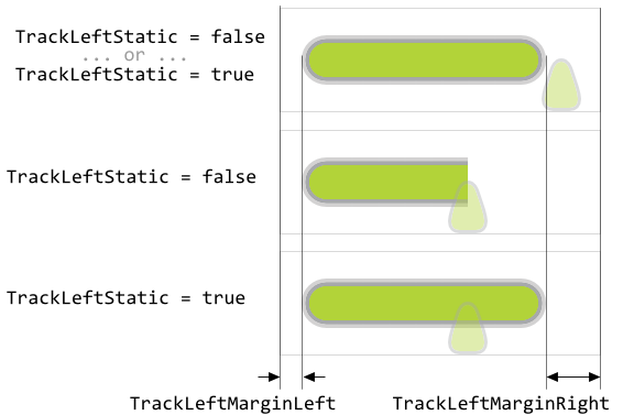 Further properties TrackLeftMarginLeft and TrackLeftMarginRight are useful to determine the minimal distances in pixel between the left/right edges of the Value Bar and the corresponding ends of the track. The so configured margins limit the range in which the track's width may change. Once the margin is reached, the track stops growing. This is also true for tracks configured to have fixed width (property TrackLeftStatic). In such case, the static track will fill the area between the margins. The following figure demonstrates the effect of the margins (the gray borders indicate the areas of the respective widget):