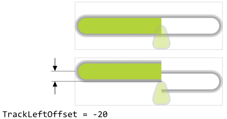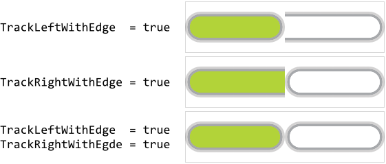 This truncation is not always desired. Depending on the design of your individual value bar, it can be necessary to always display the whole track inclusive its both end caps. This can be controlled by modifying the properties TrackLeftWithEdge and TrackRightWithEdge. If you assign the value true to the property TrackLeftWithEdge, the left track is not truncated anymore. It appears with its all edges. Similarly, if you initialize TrackRightWithEdge with true, the right track is not truncated. You can also combine both. The following figure demonstrates the effect of these properties: