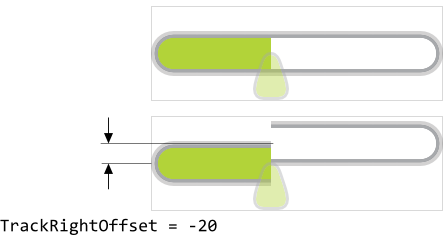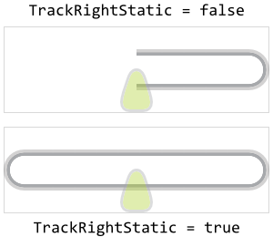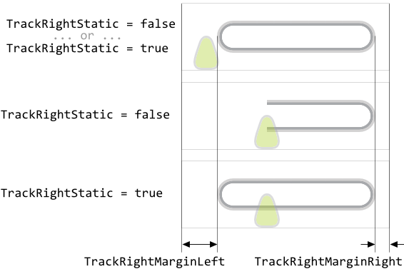Further properties TrackRightMarginLeft and TrackRightMarginRight are useful to determine the minimal distances in pixel between the left/right edges of the Value Bar and the corresponding ends of the track. The so configured margins limit the range in which the track's width may change. Once the margin is reached, the track stops growing. This is also true for tracks configured to have fixed width (property TrackRightStatic). In such case, the static track will fill the area between the margins. The following figure demonstrates the effect of the margins (the gray borders indicate the areas of the respective widget):