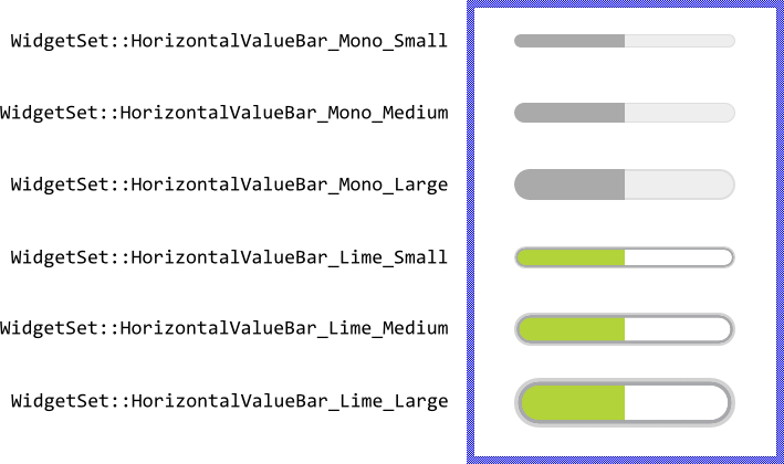 The following sections are intended to provide you an introduction and useful tips of how to work with and how to customize the Horizontal Value Bars. For the complete reference please see the documentation of the WidgetSet::HorizontalValueBar and WidgetSet::HorizontalValueBarConfig classes.