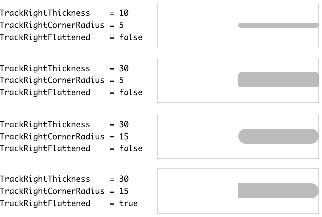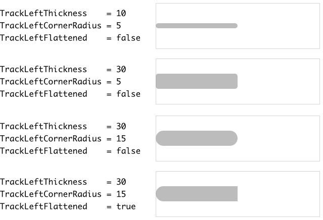 The following figure demonstrates the effect of diverse property combinations. The gray thin borders indicate the areas of the resulting Horizontal Value Bar. For demonstration purpose the track views are configured to appear with rounded corners: