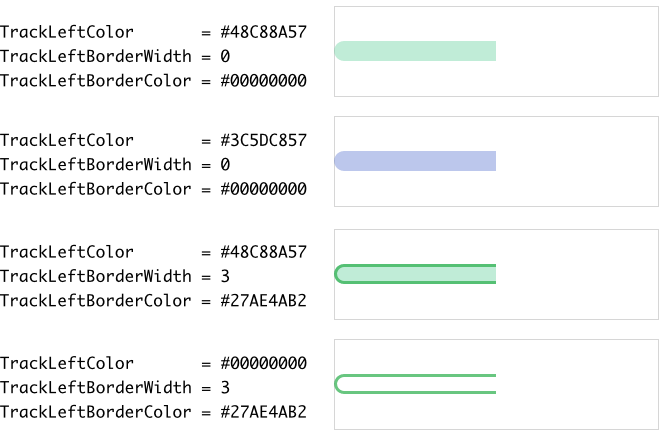 Starting with version 13, the Horizontal Value Bar enhances its visual element TrackLeft by a rectangle and border views. Those new views display the track using scalable vector graphic so that the Horizontal Value Bar is not restricted anymore to use bitmap resources only. As described in the section above the shape of the new track views can be configured. With following properties you configure the colors to fill the background of the track and to stroke its borders: