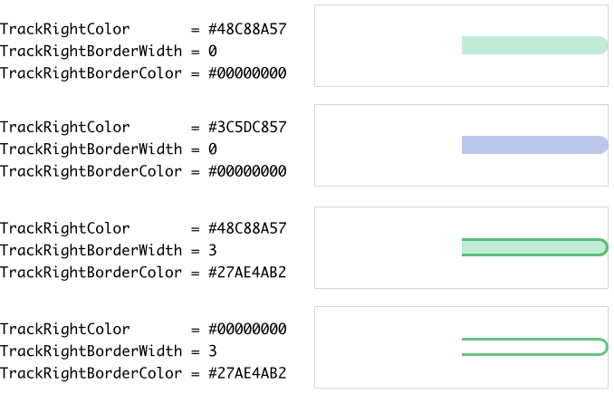 Starting with version 13, the Horizontal Value Bar enhances its visual element TrackRight by a rectangle and border views. Those new views display the track using scalable vector graphic so that the Horizontal Value Bar is not restricted anymore to use bitmap resources only. As described in the section above the shape of the new track views can be configured. With following properties you configure the colors to fill the background of the track and to stroke its borders: