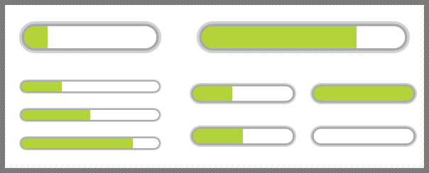 The exact appearance and behavior of the Horizontal Value Bar is determined by a Horizontal Value Bar Config object. This configuration object provides bitmaps, colors and other configuration parameters needed to construct and display the affected Horizontal Value Bar. Embedded Wizard is delivered with a set of prepared Horizontal Value Bar Config objects you can use instantly as they are. However, if desired, you can create your own configuration objects and so customize the Horizontal Value Bar widgets according to your particular design expectations. The following screenshot demonstrates few examples of how Horizontal Value Bars appear in the canvas area of Composer (and accordingly on the screen in your target device):