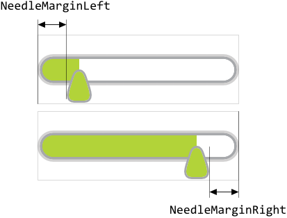 Per default, the needle can move freely across the entire width of the Horizontal Value Bar. If this is not desired, you can specify in the properties NeedleMarginLeft and NeedleMarginRight additional gaps in pixel between the needle image and the respective left or right edge of the value bar. The following figure demonstrates the effect of these properties (the gray borders indicate the areas of the respective value bar):
