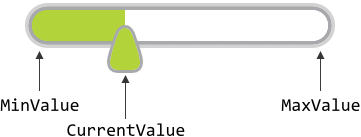 The possible value range for the property CurrentValue is determined by the both properties MinValue and MaxValue, whereby the value specified in the property MinValue corresponds to the leftmost position of the needle and the value of the property MaxValue to the rightmost position. Thus, the value of the property CurrentValue lies always between MinValue and MaxValue. The following figure demonstrates the relations between the three properties: