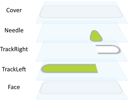 The left and the right track images fill the corresponding areas on the left and on the right of the needle. As described in the chapters above, it is achieved by so-called 9-slice image scaling technique where the respective area is filled with slices copied from the original track bitmap. The both track images join together at the current needle position. To produce an effect of the both tracks being connected seamlessly, the tracks are per default truncated at this position. You can imagine, the right cap of the left track and the left cap of the right track are not displayed. This is demonstrated in the following figure: