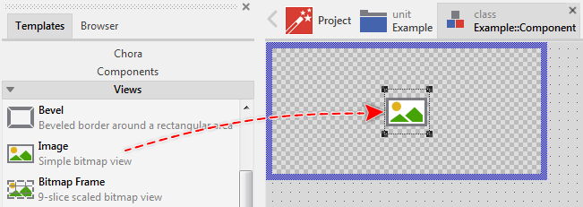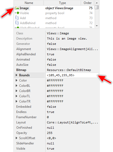 The content to display within an Image view is determined by its property Bitmap. Usually, you initialize this property with the name of an existing bitmap resource member, which is typical for all immutable contents like button icons, screen backgrounds and any other decorations well known already at the design time. With the Inspector Assistant you can conveniently select the right resource when you edit the initialization expression for the property Bitmap.