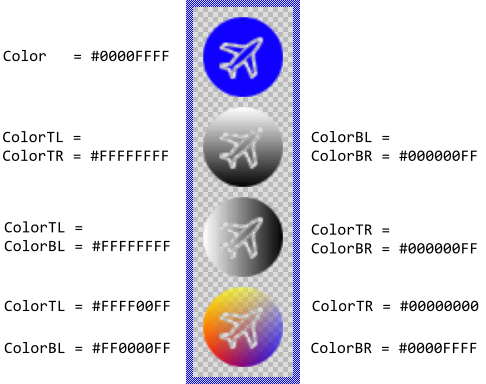 To specify the color you use the property Color. Alternatively you can configure the bitmap to be colorized with a color gradient. For this purpose you specify the colors for the four corners of the Image view (top-left, top-right, bottom-right and bottom-left) individually by using the corresponding properties ColorTL, ColorTR, ColorBR and ColorBL. The gradient colors are interpolated linearly between the specified values. Using colors with alpha < 255 causes the bitmap to appear semi- or even transparent. For example:
