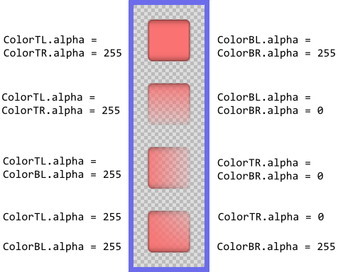Additionally you can specify for every corner (top-left, top-right, bottom-right and bottom-left) an individual opacity value resulting in the bitmap being modulated by an opacity gradient. For this purpose modify the alpha values of the corresponding properties ColorTL, ColorTR, ColorBR and ColorBL. For example: