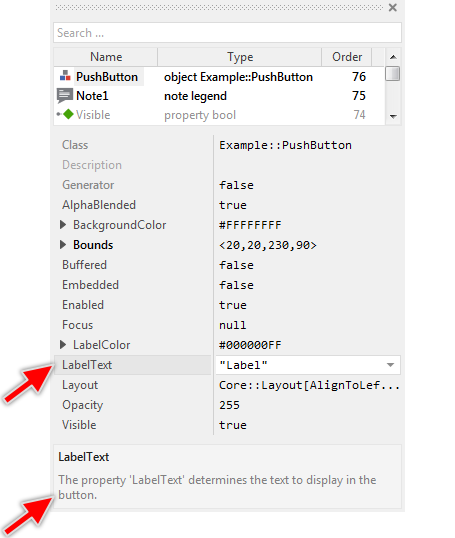 Generally, when you implement a GUI component you should add to it for every parameter you plan later to configure dynamically a corresponding property. The convenient thing about this approach is, that all the properties you have added to the component are automatically listed in the Inspector window when you select an instance of this component. The properties can then be inspected and modified easily. Moreover, if you have left some description for the property, this description appears in the bottom area of the Inspector window: