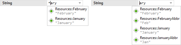 Please note, when using the wildcard signs, the suggestion has to match the complete specified pattern in order to be listed in the Assistant window. For example, the pattern *ary matches only suggestions ending with the text ary with any or even none text in front of it. In turn, the pattern ary (without any wildcard signs) matches all suggestions containing the text ary regardless of its position: