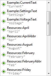 In its simplest variant the Assistant displays a list with suggestions (usually members of your project) compatible to the type of the selected property or attribute. For example, activating the Assistant for a property of type string will cause the Assistant to present all string constants existing in your project: