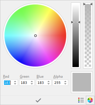 In turn, the functions of the color wheel view and the associated workflow are described in Color selection dialog. Please note, when working with the color wheel view, you have to explicitly apply the made color selection: