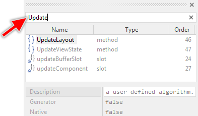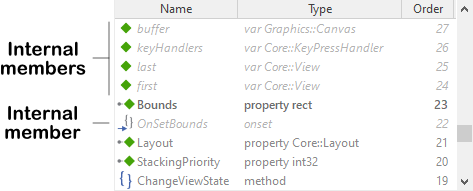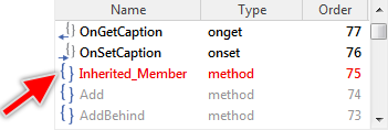 The list is sorted alphabetically according to the text in the column Name. However, if you click this column caption twice, the members are sorted first by inheritance and then by their names. If sorting by inheritance, the list displays first all new members, followed then by all inherited and overridden members. Finally at the end of the list appear all remaining inherited but no overridden members. |