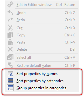 Beginning with version 13 the mode how properties are displayed in the Inspector window can be configured. The properties can be sorted by their names, sorted by categories or grouped by categories. In the last case, the user can expand and collapse the categories individually for better overview. Before version 13 the properties were sorted by their names only: