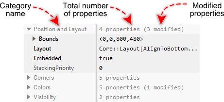 When sorting or grouping the properties by categories, the Inspector displays the corresponding category names in gray color and slightly highlighted background to differentiate the categories from regular properties. For each category the number of subordinated properties is displayed. If there are some properties modified, the number of modified properties is displayed too to increase the productivity: