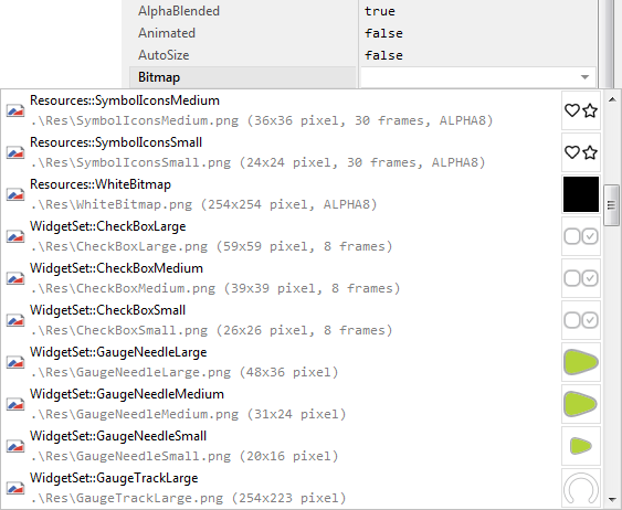 For your convenience the Inspector includes an Assistant window. It helps in particular to find and select the right operand when you edit initialization expression of attributes or properties. For example, the Assistant can list all bitmap resources existing in your project, so you can select the desired one easily: