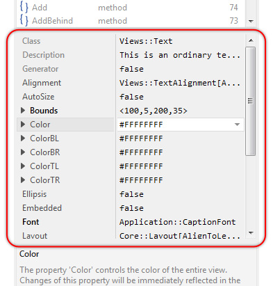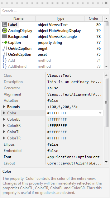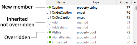 Since a class inherits all members from its base class, the listing of all those members in the Inspector window would quickly become confusing. Therefore, the members are presented with different fonts and colors. Per default, new members are displayed with bold, black font. In turn, members inherited from an ancestor class appear with thin, gray font. If an inherited member is overridden within the actual class, the item is displayed with bold, gray font. Knowing this, you can easily distinguish between newly added, inherited and overridden members: