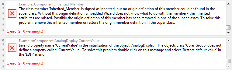 Please note, that Embedded Wizard Studio reports the corresponding error messages in the Log window including tips of how to solve the problem: