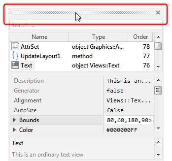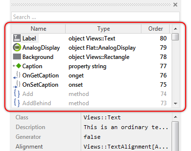 You can apply a filter pattern to the content of the members list and thus find the desired member in a more convenient way. For this purpose the Inspector window provides in its upper area the Search ... edit field. With the active filter function, the Inspector displays only those members, which in fact do match the specified filter pattern. Other members are hidden: