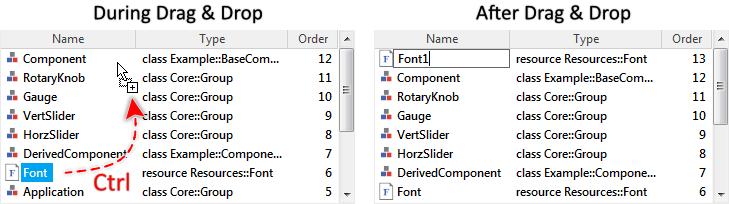 The following screenshot demonstrates the practical usage of Drag & Drop. To duplicate a member (here a font resource member) you select it first and then you move it with the mouse while holding the key Ctrl pressed. Finally you drop the member at the desired location within Composer or Inspector window. Note, that the rename operation is automatically activated just after you drop a new member within the members area of the Inspector: