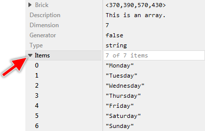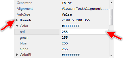 The list is composed of two columns displaying the names of attributes or properties on the left and the corresponding values on the right, both separated by a splitter bar you can drag with the mouse if you want to resize the columns. Within the white in-place edit field you edit the currently selected value. The small triangle icon
