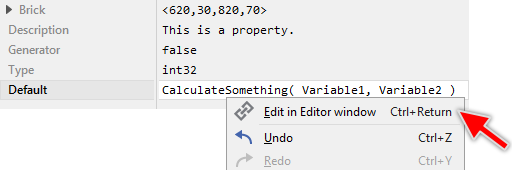 Using the keyboard shortcut CtrlEnter you can conveniently switch forth and back between the Inspector and the Code Editor. In particular, pressing the keys CtrlEnter in the Code Editor window while it is linked to Inspector causes the editor content being transferred to the associated attribute or property selected in Inspector.