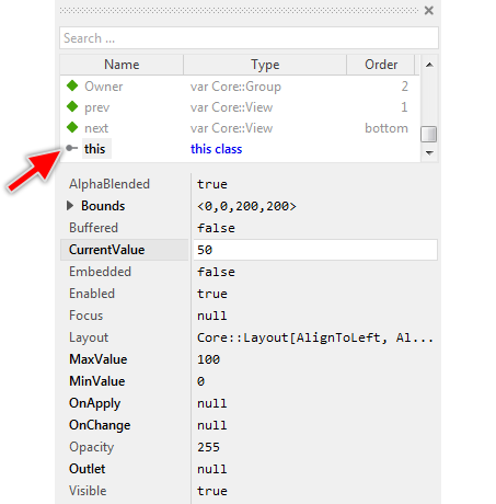If you are current editing a class or class variant, the members list includes an additional entry this representing the actual class. Inspecting this entry provides you an alternative access to the properties existing within the class as if you were editing an instance of the class. For example: