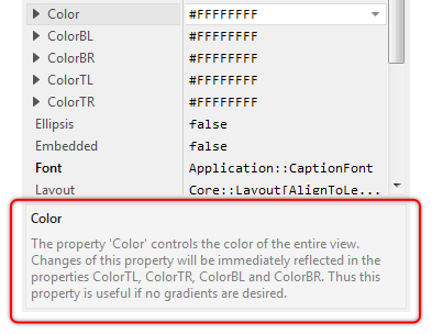 The lower part of the Inspector window displays the available description of project members, their attributes and properties. Each time, you select a member in Composer or Inspector, or you select an attribute or property in the attributes and properties area of the Inspector the displayed description is automatically updated to provide you information about the selected entity: